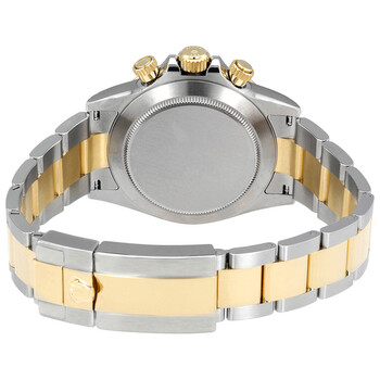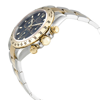 Stainless steel case with a stainless steel Rolex oyster bracelet with 18kt yellow gold center links. Fixed 18kt yellow gold bezel showing tachymeter markings. Black dial with luminous yellow gold-tone hands and index hour markers. Minute markers around the outer rim. Dial Type: Analog. Luminescent hands and dial markers. Chronograph - three sub-dials displaying: 60 second, 30 minute and 12 hour. Rolex calibre 4130 automatic movement with a 72-hour power reserve. Scratch resistant sapphire crystal. Screw down crown. Solid case back. Round case shape. Case size: 40 mm. Oysterlock clasp. Water resistant at 100 meters / 330 feet. Functions: chronograph, hour, minute, second, chronometer, tachymeter. Luxury watch style. Watch label: Swiss Made. Item Variations: 116523-78593. Rolex Cosmograph Daytona Black Dial Stainless steel and 18K Yellow Gold Oyster Bracelet Automatic Men's Watch 116523BKSO.