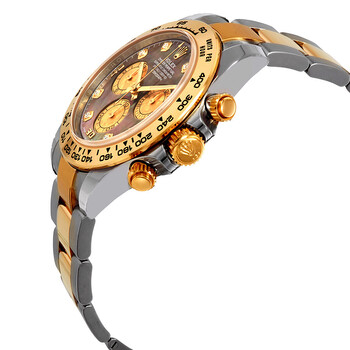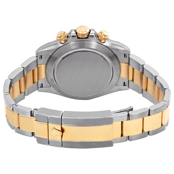 Stainless steel and 18kt yellow gold case with a two-tone (silver-tone and gold-tone) stainless steel and 18k yellow gold rolex oyster bracelet. Fixed tachymeter scale 18kt yellow gold bezel. Black mother of pearl dial with gold-tone hands and diamond hour markers. Minute markers around the outer rim. Dial Type: Analog. Luminescent hands. Chronograph - three sub-dials displaying: 60 second, 30 minute and 12 hours. Rolex Calibre 4130 automatic movement with a 72-hour power reserve. Scratch resistant sapphire crystal. Screw down crown. Solid case back. Round case shape. Case size: 40 mm. Oysterlock clasp. Water resistant at 100 meters / 330 feet. Functions: chronograph, hour, minute, small second, chronometer. Luxury watch style. Watch label: Swiss Made. Rolex Cosmograph Daytona Black Mother Of Pearl Diamond Dial Men's Watch 116503BKMDO.