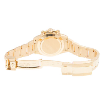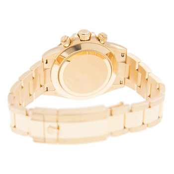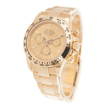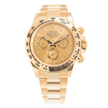 18kt yellow gold case with a 18kt yellow gold rolex oyster bracelet. Fixed bezel. Champagne dial with gold-tone hands and index hour markers. Tachymeter. Dial Type: Analog. Luminescent hands and markers. Chronograph - three sub-dials displaying: 60 second, 30 minute and 1/10th of a second. Rolex Calibre 4130 automatic movement with a 72-hour power reserve. Scratch resistant sapphire crystal. Screw down crown. Solid case back. Case size: 40 mm. Round case shape. Water resistant at 100 meters / 330 feet. Functions: chronograph, hour, minute, second. Luxury watch style. Watch label: Swiss Made. Rolex Cosmograph Daytona Champagne Dial Men's Chronograph Oyster Watch 116508CSO.