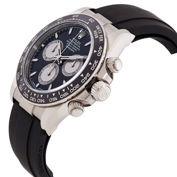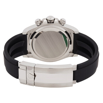18kt white gold case with a black rubber strap. Fixed tachymeter scale black cerachrom bezel. Black dial with silver-tone hands and index hour markers. Minute markers around the outer rim. Dial Type: Analog. Luminescent hands and markers. Chronograph - three sub-dials displaying: 60 second, 30 minute and 12 hour. Rolex Calibre 4131 Automatic movement, based upon Rolex Calibre 4130, containing 47 Jewels, bitting at 28800 vph, and has a power reserve of approximately 72 hours. Scratch resistant sapphire crystal. Screw down crown. Solid case back. Round case shape, case size: 40 mm. Folding oysterlock clasp. Water resistant at 100 meters / 330 feet. Functions: chronograph, hour, minute, small second, chronometer. Cosmograph Daytona Series. Luxury watch style. Watch label: Swiss Made. Item Variations: M126519LN-0001. Rolex Cosmograph Daytona Chronograph Automatic Black Dial Men's Watch 126519LN-0001.
