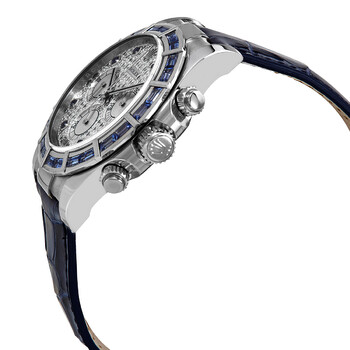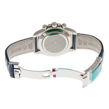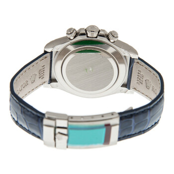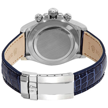 18kt white gold case with a blue leather strap. Fixed tachymeter scale bezel with diamond set. Pave diamond dial with diamond hour markers. Minute markers around the outer rim. Dial Type: Analog. Luminescent hands. Rolex Calibre 4130 Automatic movement, based upon Rolex 4030, containing 44 Jewels, bitting at 28800 vph, and has a power reserve of approximately 72 hours. Scratch resistant sapphire crystal. Screw down crown. Solid case back. Round case shape, case size: 40 mm. Tang clasp. Water resistant at 100 meters / 330 feet. Functions: chronograph, hour, minute, second, chronometer. Cosmograph Daytona Series. Luxury watch style. Watch label: Swiss Made. Rolex Cosmograph Daytona Chronograph Automatic Chronometer Diamond Men's Watch 116589 SBLDPAVL.