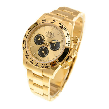 18kt yellow gold case and bracelet. Fixed tachymeter scale 18kt yellow gold bezel. Gold dial with gold-tone hands and index hour markers. Minute markers around the outer rim. Dial Type: Analog. Luminescent hands and markers. Chronograph - three sub-dials displaying: 60 second, 30 minute and 12 hour. Rolex Calibre 4131 Automatic movement, based upon Rolex Calibre 4130, containing 47 Jewels, bitting at 28800 vph, and has a power reserve of approximately 72 hours. Scratch resistant sapphire crystal. Screw down crown. Solid case back. Round case shape, case size: 40 mm. Oysterlock clasp. Water resistant at 100 meters / 330 feet. Functions: chronograph, hour, minute, small second, chronometer. Cosmograph Daytona Series. Luxury watch style. Watch label: Swiss Made. Item Variations: M126508-0006. Rolex Cosmograph Daytona Chronograph Automatic Chronometer Gold Dial Men's Watch 126508-0006.
