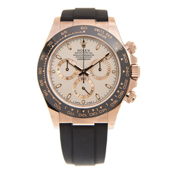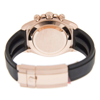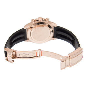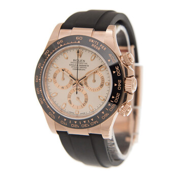 Rose gold-tone 18kt rose gold case with a black rubber strap. Fixed tachymeter scale black ceramic bezel. White dial with rose gold-tone hands and index hour markers. Minute markers around the outer rim. Dial Type: Analog. Luminescent hands and markers. Chronograph - three sub-dials displaying: 60 second, 30 minute and 12 hour. Rolex Calibre 4130 Automatic movement, based upon Rolex 4030, containing 44 Jewels, bitting at 28800 vph, and has a power reserve of approximately 72 hours. Scratch resistant sapphire crystal. Screw down crown. Solid case back. Round case shape, case size: 40 mm. Oysterlock clasp. Water resistant at 100 meters / 330 feet. Functions: chronograph, hour, minute, small second, chronometer. Cosmograph Daytona Series. Luxury watch style. Watch label: Swiss Made. Rolex Cosmograph Daytona Chronograph Automatic Chronometer White Dial Men's Watch 116515LNIR.