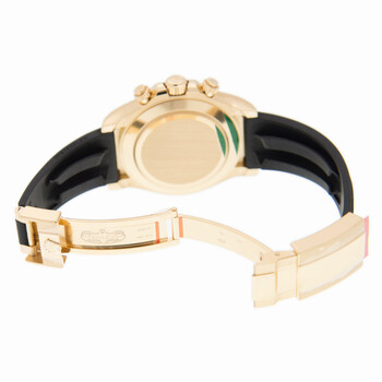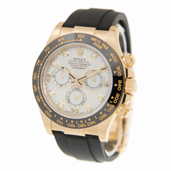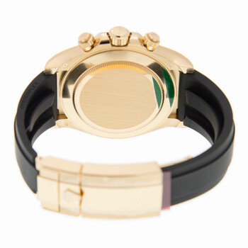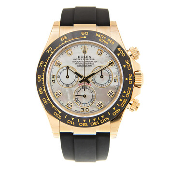 18kt yellow gold case with a black rubber strap. Fixed tachymeter scale cerachrom bezel. Mother of pearl dial with diamond hour markers. Minute markers around the outer rim. Dial Type: Analog. Luminescent hands and markers. Chronograph - three sub-dials displaying: 60 second, 30 minute and 12 hour. Rolex Calibre 4130 automatic movement with a 72-hour power reserve. Scratch resistant sapphire crystal. Screw down crown. Solid case back. Round case shape. Case size: 40 mm. Oysterlock clasp. Water resistant at 100 meters / 330 feet. Functions: chronograph, hour, minute, second. Luxury watch style. Watch label: Swiss Made. Rolex Cosmograph Daytona Chronograph Automatic Diamond Men's Watch 116518 MDR.