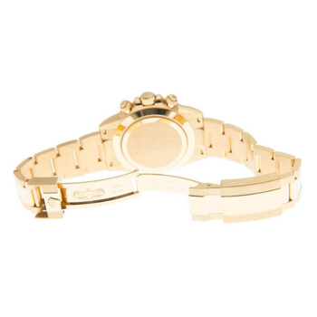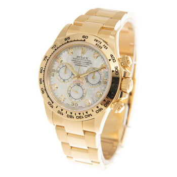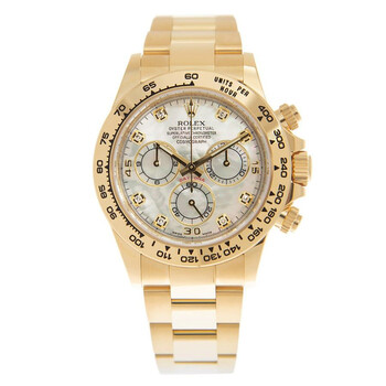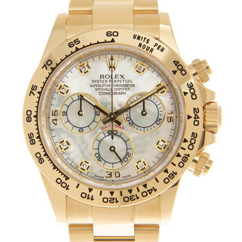 Yellow gold-tone 18kt yellow gold case with a yellow gold-tone 18kt yellow gold rolex oyster bracelet. Fixed tachymeter scale yellow gold-tone 18kt yellow gold bezel. White mother of pearl dial with yellow gold-tone hands and diamonds hour markers. Tachymetric scale. Dial Type: Analog. Luminescent hands. Chronograph - three sub-dials displaying: 60 second, 30 minute and 12 hour. Rolex Calibre 4130 Automatic movement, based upon Rolex 4030, containing 44 Jewels, bitting at 28800 vph, and has a power reserve of approximately 72 hours. Scratch resistant sapphire crystal. Screw down crown. Solid case back. Round case shape, case size: 40 mm. Fold over clasp. Water resistant at 100 meters / 330 feet. Functions: chronograph, hour, minute, second. Cosmograph Daytona Series. Luxury watch style. Watch label: Swiss Made. Rolex Cosmograph Daytona Chronograph Automatic Diamond White Mother of Pearl Dial Men's Watch 116508WMDO.