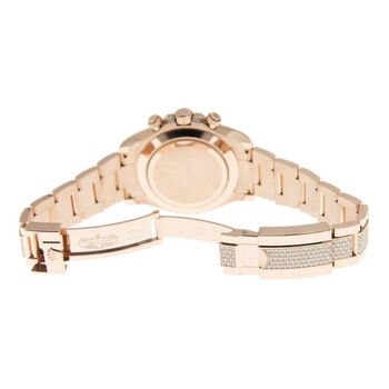 18kt rose gold case with a gold-tone 18kt rose gold with pave diamond bracelet. Fixed 36 baguette-cut sapphires bezel. Pave dial with diamond hour markers. Dial Type: Analog. Chronograph - three sub-dials displaying: 60 second, 30 minute and 12 hour. Rolex Calibre 4130 Automatic movement, based upon Rolex 4030, containing 44 Jewels, bitting at 28800 vph, and has a power reserve of approximately 72 hours. Scratch resistant sapphire crystal. Screw down crown. Solid case back. Round case shape, case size: 40 mm. Water resistant at 100 meters / 330 feet. Functions: chronograph, hour, minute, small second, chronometer. Cosmograph Daytona Series. Luxury watch style. Watch label: Swiss Made. Rolex Cosmograph Daytona Chronograph Automatic Rainbow Pave Watch 116595RBOW-0002.