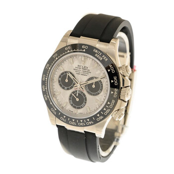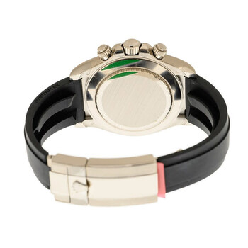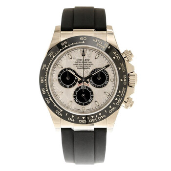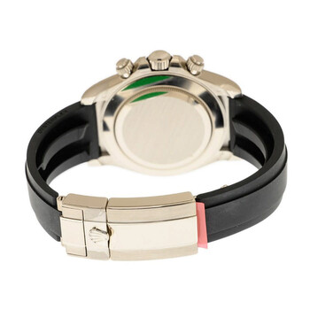 18k white gold case with a black rubber strap. Black ceramic bezel. Meteorite & black dial with silver-tone hands and index hour markers. Tachymeter scale around the outer rim. Dial Type: Analog. Luminescent hands and markers. Chronograph - three sub-dials displaying: 12 hours, 30 minutes, 60 seconds. Rolex Calibre 4130 Automatic movement, based upon Rolex 4030, containing 44 Jewels, bitting at 28800 vph, and has a power reserve of approximately 72 hours. Scratch resistant sapphire crystal. Screw down crown. Screw-down case back. Round case shape, case size: 40 mm. Folding clasp. Water resistant at 100 meters / 330 feet. Functions: chronograph, hour, minute, second, chronometer. Cosmograph Daytona Series. Luxury watch style. Watch label: Swiss Made. Rolex Cosmograph Daytona Chronograph Automatic Watch 116519MTSR.