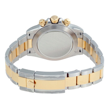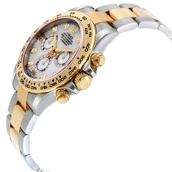 Stainless steel case with a stainless steel Rolex oyster bracelet and 18kt yellow gold center links. Fixed 18kt yellow gold bezel showing tachymeter markings. Mother of pearl dial with yellow gold hands and diamond hour markers. Minute markers around the outer rim. Dial Type: Analog. Luminescent hands. Chronograph - three sub-dials displaying: 60 second, 30 minute and 12 hour. Rolex calibre 4130 automatic movement with a 72-hour power reserve. Scratch resistant sapphire crystal. Screw down crown. Solid case back. Case size: 40 mm. Round case shape. Oysterlock clasp. Water resistant at 100 meters / 330 feet. Functions: chronograph, tachymeter, hour, minute, second. Luxury watch style. Watch label: Swiss Made. Rolex Cosmograph Daytona Mother of Pearl Diamond Steel and 18K Yellow Gold Men's Watch 116503MDO.