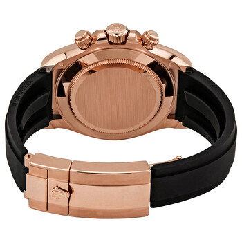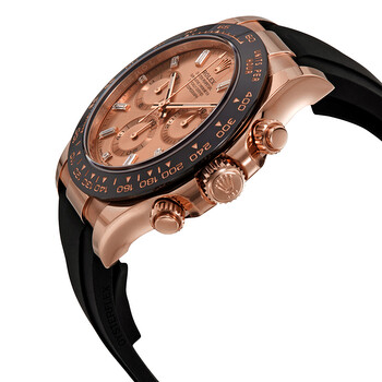 18kt everose gold case with a black oysterflex band. Fixed tachymeter scale black ceramic bezel. Pink dial with everose gold hands and diamond hour markers. Tachymeter. Dial Type: Analog. Luminescent hands and markers. Chronograph - three sub-dials displaying: 60 second, 30 minute and 1/10th of a second. Rolex Calibre 4130 automatic movement with a 72-hour power reserve. Scratch resistant sapphire crystal. Screw down crown. Solid case back. Round case shape. Case size: 40 mm. Oysterlock clasp. Water resistant at 100 meters / 330 feet. Functions: chronograph, hour, minute, second. Luxury watch style. Watch label: Swiss Made. Rolex Cosmograph Daytona Pink Diamond Dial Men's Chronograph Oysterflex Watch 116515PKDR.