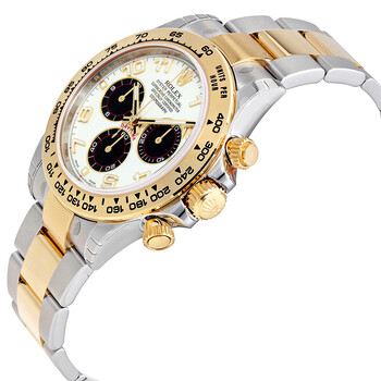 Stainless steel case with a stainless steel Rolex oyster bracelet with 18kt yellow gold center links. Fixed 18kt yellow gold bezel showing tachymeter markings. Ivory dial with luminous yellow gold-tone hands and index hour markers. Minute markers around the outer rim. Dial Type: Analog. Chronograph - three black sub-dials displaying: 60 second, 30 minute and 12 hour. Rolex calibre 4130 automatic movement with a 72-hour power reserve. Scratch resistant sapphire crystal. Screw down crown. Solid case back. Case size: 40 mm. Round case shape. Oysterlock clasp. Water resistant at 100 meters / 330 feet. Functions: chronograph, hour, minute, second. Luxury watch style. Watch label: Swiss Made. Rolex Cosmograph Daytona Stainless Steel and 18K Yellow Gold Automatic Men's Watch 116503IBKAO.