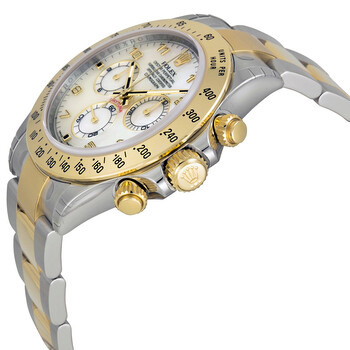 Stainless steel and 18k yellow gold case with a stainless steel and 18k yellow gold rolex oyster bracelet. Fixed - 18k yellow gold (tachymeter engraved) bezel. White mother of pearl dial with yellow gold-tone hands and Arabic numeral hour markers. Minute markers around the outer rim. Dial Type: Analog. Luminescent hands and dial markers. Chronograph - three sub-dials displaying: 60 second, 30 minute and 12 hour. Automatic movement. Scratch resistant sapphire crystal. Case diameter: 40 mm. Round case shape. Deployment clasp. Water resistant at 100 meters / 330 feet. Functions: chronograph, hour, minute, second. Luxury watch style. Watch label: Swiss Made. Item Variations: 116523, 116523-MAO, Rolex-116523, Rolex-116523-MAO. Rolex Cosmograph Daytona White Mother of Pearl Dial Stainless steel and 18K Yellow Gold Rolex Oyster Automatic Men's Watch 116523MAO.