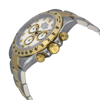Stainless steel and 18kt yellow gold case with a two-tone (silver-tone and yellow gold-tone) stainless steel and 18kt yellow gold rolex oyster bracelet. Fixed tachymeter scale 18kt yellow gold bezel. White with 8 diamonds dial with yellow gold-tone hands and diamond hour markers. Minute markers around outer rim. Dial Type: Analog. Luminescent hands. Chronograph - three sub-dials displaying: 60 second, 30 minute and 12 hour. Rolex Calibre 4130 Automatic movement, based upon Rolex 4030, containing 44 Jewels, bitting at 28800 vph, and has a power reserve of approximately 72 hours. Scratch resistant sapphire crystal. Screw down crown. Solid case back. Round case shape, case size: 40 mm. Oysterlock clasp. Water resistant at 100 meters / 330 feet. Functions: chronograph, hour, minute, second, chronometer. Cosmograph Daytona Series. Luxury watch style. Watch label: Swiss Made. Item Variations: 116523, 116523-WDO, Rolex-116523, Rolex-116523-WDO. Rolex Cosmograph Daytona White With 8 Diamonds Dial Stainless steel and 18K Yellow Gold Oyster Bracelet Automatic Men's Watch 116523WDO.
