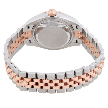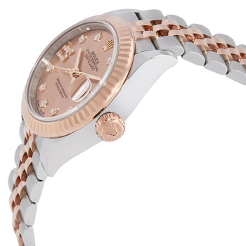 Stainless steel & rose gold case with a brushed & polished stainless steel & rose gold jubilee bracelet. Fixed rose gold bezel. Sundust dial with rose gold-tone hands and diamond-Roman numeral hour markers. Dial Type: Analog. Date display at the 3 o'clock position. Rolex Calibre 2236 Automatic movement, based upon Rolex 2235, containing 31 Jewels, bitting at 28800 vph, and has a power reserve of approximately 55 hours. Scratch resistant sapphire crystal. Screw down crown. Solid case back. Round case shape, case size: 28 mm. Rolex concealed folding crown clasp. Water resistant at 100 meters / 330 feet. Functions: date, hour, minute, second, chronometer. Datejust 28mm Series. Luxury watch style. Watch label: Swiss Made. Rolex Datejust 28mm Automatic Chronometer Diamond Ladies Watch 279171SNDJ.