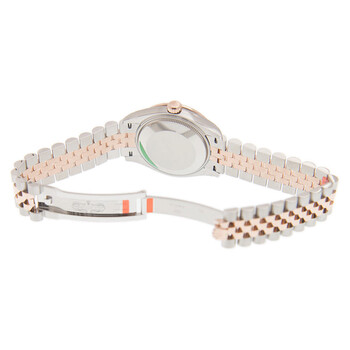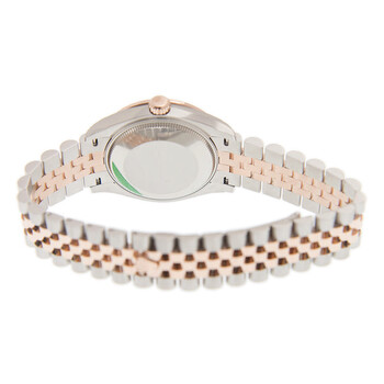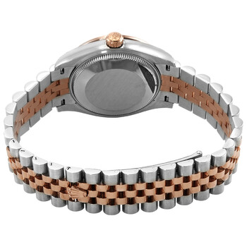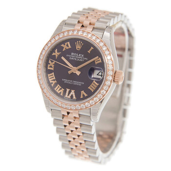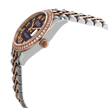 Stainless steel case with a stainless steel Rolex jubilee bracelet with 18kt everose gold center links. Fixed 18kt everose gold bezel set with diamonds. Aubergine dial with everose gold hands and Roman numeral hour markers. A diamond-set Roman numeral appears at the 12 o'clock position. Dial Type: Analog. Date display at the 3 o'clock position. Rolex calibre 2236 automatic movement, based upon Rolex 2235, containing 31 Jewels, bitting at 28800 vph, and has a power reserve of approximately 55 hours. Scratch resistant sapphire crystal. Screw down crown. Solid case back. Round case shape. Case size: 31 mm. Crown fold over clasp. Water resistant at 100 meters / 330 feet. Functions: date, hour, minute, second. Datejust 31 Series. Luxury watch style. Watch label: Swiss Made. Rolex Datejust 31 Aubergine Dial Automatic Ladies Steel and 18kt Everose Gold Jubilee Watch 278381AURDJ.