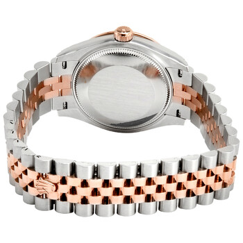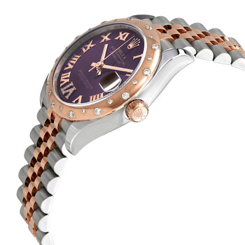 Stainless steel case with a stainless steel Rolex jubilee bracelet with 18kt everose gold links. Fixed 18kt everose gold bezel set with diamonds. Aubergine dial with 18kt everose gold hands and Roman numeral hour markers. Dial Type: Analog. Date display at the 3 o'clock position. Rolex calibre 2236 automatic movement, based upon Rolex 2235, containing 31 Jewels, bitting at 28800 vph, and has a power reserve of approximately 55 hours. Scratch resistant sapphire crystal. Screw down crown. Solid case back. Round case shape. Case size: 31 mm. Folding clasp. Water resistant at 100 meters / 330 feet. Functions: date, hour, minute, second. Datejust 31 Series. Luxury watch style. Watch label: Swiss Made. Rolex Datejust 31 Aubergine Dial Ladies Steel and 18kt Everose Gold Jubilee Watch 278341AURDJ.