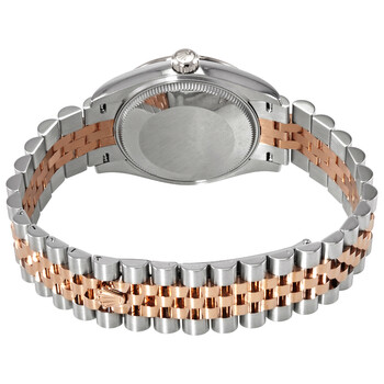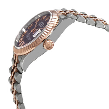 Stainless steel case with a stainless steel Rolex jubilee bracelet with 18kt everose gold center links. Fixed fluted 18kt everose gold bezel. Aubergine dial with everose gold hands and Roman numeral hour markers. Dial Type: Analog. Date display at the 3 o'clock position. Rolex calibre 2236 automatic movement, based upon Rolex 2235, containing 31 Jewels, bitting at 28800 vph, and has a power reserve of approximately 55 hours. Scratch resistant sapphire crystal. Screw down crown. Solid case back. Round case shape. Case size: 31 mm. Fold over w clasp. Water resistant at 100 meters / 330 feet. Functions: date, hour, minute, second. Datejust 31 Series. Luxury watch style. Watch label: Swiss Made. Rolex Datejust 31 Aubergine Diamond Dial Automatic Ladies Steel and 18kt Everose Gold Jubilee Watch 278271AURDJ.