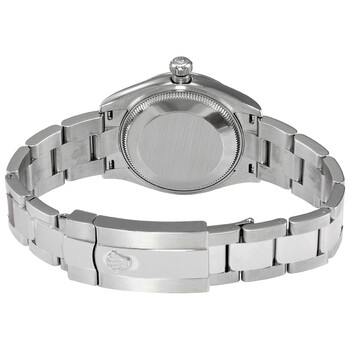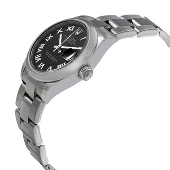 Stainless steel case with a stainless steel Rolex oyster bracelet. Fixed stainless steel bezel. Black dial with silver-tone hands and Roman numeral hour markers. Dial Type: Analog. Date display at the 3 o'clock position. Rolex calibre 2236 automatic movement, based upon Rolex 2235, containing 31 Jewels, bitting at 28800 vph, and has a power reserve of approximately 55 hours. Scratch resistant sapphire crystal. Screw down crown. Screw down case back. Round case shape. Case size: 31 mm. Fold over clasp. Water resistant at 100 meters / 330 feet. Functions: date, hour, minute, second. Datejust 31 Series. Luxury watch style. Watch label: Swiss Made. Rolex Datejust 31 Automatic Black Dial Ladies Watch 278240BKRO.