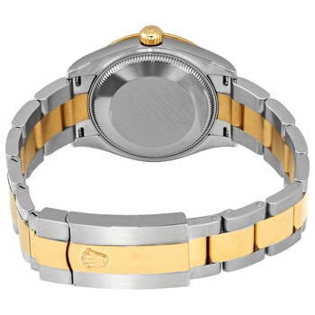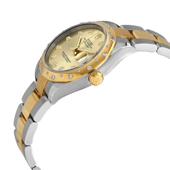 Stainless steel case with a stainless steel oyster bracelet with 18kt yellow gold center links. Fixed 18kt yellow gold bezel set with diamonds. Champagne dial with yellow gold hands and diamond hour markers. Dial Type: Analog. Date display at the 3 o'clock position. Rolex calibre 2236 automatic movement, based upon Rolex 2235, containing 31 Jewels, bitting at 28800 vph, and has a power reserve of approximately 55 hours. Scratch resistant sapphire crystal. Screw down crown. Solid case back. Round case shape. Case size: 31 mm. Folding oyster clasp. Water resistant at 100 meters / 330 feet. Functions: date, hour, minute, second, chronometer. Datejust 31 Series. Luxury watch style. Watch label: Swiss Made. Rolex Datejust 31 Automatic Champagne Diamond Dial Ladies Steel and 18kt Yellow Gold Oyster Watch 278343CDO.