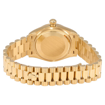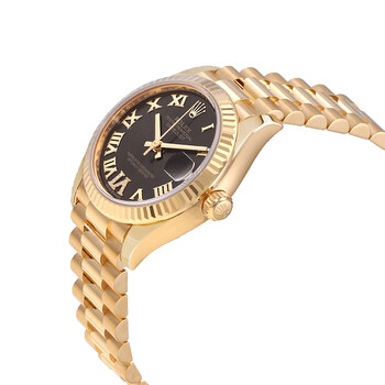 18kt yellow gold case with a 18kt yellow gold president bracelet. Fixed fluted 18kt yellow gold bezel. Dark grey dial with luminous yellow gold hands and Roman numeral hour markers. Dial Type: Analog. Date display at the 3 o'clock position. Rolex calibre 2236 automatic movement, based upon Rolex 2235, containing 31 Jewels, bitting at 28800 vph, and has a power reserve of approximately 55 hours. Scratch resistant sapphire crystal. Screw down crown. Transparent case back. Round case shape. Case size: 31 mm. Oysterlock clasp. Water resistant at 100 meters / 330 feet. Functions: date, hour, minute, second, chronometer. Datejust 31 Series. Luxury watch style. Watch label: Swiss Made. Rolex Datejust 31 Automatic Chronometer Ladies Watch 278278GYRDP.