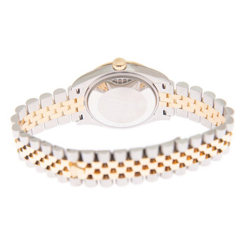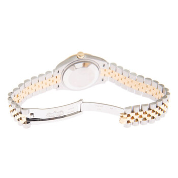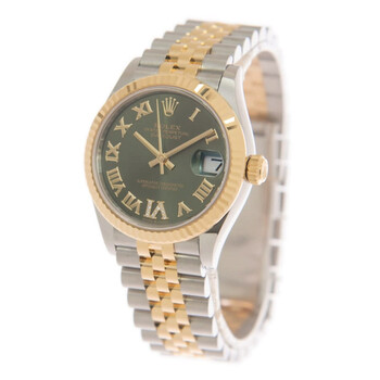 Silver-tone stainless steel case with a two-tone (silver-tone and yellow gold-tone) stainless steel and 18kt yellow gold jubilee bracelet. Fixed fluted yellow gold-tone 18kt yellow gold bezel. Green dial with gold-tone hands and Roman numeral with diamonds at the 6 o'clock hour markers. Dial Type: Analog. Date display at the 3 o'clock position. Rolex Calibre 2236 Automatic movement, based upon Rolex 2235, containing 31 Jewels, bitting at 28800 vph, and has a power reserve of approximately 55 hours. Scratch resistant sapphire crystal. Screw down crown. Solid case back. Round case shape, case size: 31 mm. Rolex concealed folding crown clasp. Water resistant at 100 meters / 330 feet. Functions: date, hour, minute, second. Datejust Series. Luxury watch style. Watch label: Swiss Made. Rolex Datejust 31 Automatic Diamond Green Dial Ladies Watch 278273GNRJ.