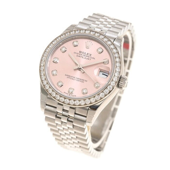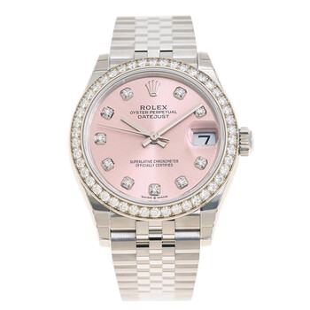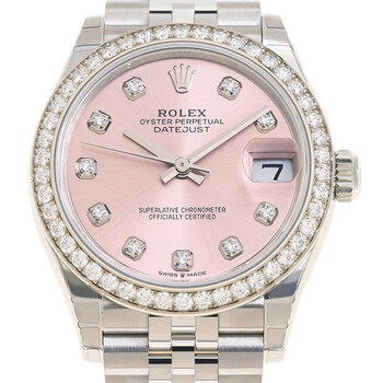 Silver-tone stainless steel/ 18k white gold case with a silver-tone stainless steel rolex jubilee bracelet. Silver-tone diamond set bezel. Pink dial with silver-tone hands and diamond hour markers. Dial Type: Analog. Date display at the 3 o'clock position. Rolex Calibre 2236 Automatic movement, based upon Rolex 2235, containing 31 Jewels, bitting at 28800 vph, and has a power reserve of approximately 55 hours. Scratch resistant sapphire crystal. Screw down crown. Screw-down case back. Round case shape, case size: 31 mm. Folding clasp. Water resistant at 100 meters / 330 feet. Functions: date, hour, minute, second. Datejust 31 Series. Dress watch style. Watch label: Swiss Made. Rolex Datejust 31 Automatic Diamond Pink Dial Ladies Watch 278384PDJ.