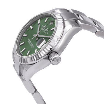 Silver-tone stainless steel/18k white gold case with a silver-tone stainless steel rolex oyster bracelet. Silver-tone stainless steel bezel. Mint green dial with silver-tone hands and index hour markers. Dial Type: Analog. Luminescent hands and markers. Date display at the 3 o'clock position. Rolex Calibre 2236 Automatic movement, based upon Rolex 2235, containing 31 Jewels, bitting at 28800 vph, and has a power reserve of approximately 55 hours. Scratch resistant sapphire crystal. Screw down crown. Screw-down case back. Round case shape, case size: 31 mm. Folding clasp. Water resistant at 100 meters / 330 feet. Functions: date, hour, minute, second. Datejust 31 Series. Watch label: Swiss Made. Rolex Datejust 31 Automatic Ladies Watch 278274GNSO.
