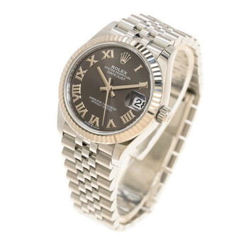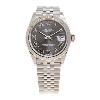 Silver-tone stainless steel case with a silver-tone stainless steel rolex jubilee bracelet. Fixed 18kt white gold bezel. Dark grey dial with silver-tone hands and Roman numeral hour markers. Dial Type: Analog. Date display at the 3 o'clock position. Rolex Calibre 2236 Automatic movement, based upon Rolex 2235, containing 31 Jewels, bitting at 28800 vph, and has a power reserve of approximately 55 hours. Scratch resistant sapphire crystal. Screw down crown. Screw-down case back. Round case shape, case size: 31 mm. Folding clasp. Water resistant at 100 meters / 330 feet. Functions: date, hour, minute, second. Datejust Series. Luxury watch style. Watch label: Swiss Made. Rolex Datejust 31 Automatic Ladies Watch 278274GYRJ.