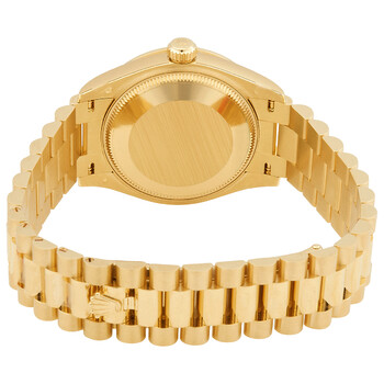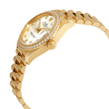 18kt yellow gold case with a 18kt yellow gold rolex president bracelet. Fixed- diamond set 18kt yellow gold bezel. Silver dial with yellow gold hands and diamond hour markers. Dial Type: Analog. Date display at the 3 o'clock position. Rolex Calibre 2236 Automatic movement, based upon Rolex 2235, containing 31 Jewels, bitting at 28800 vph, and has a power reserve of approximately 55 hours. Scratch resistant sapphire crystal. Screw down crown. Solid case back. Round case shape, case size: 31 mm. Folding clasp. Water resistant at 100 meters / 330 feet. Functions: date, hour, minute, second. Datejust 31 Series. Luxury watch style. Watch label: Swiss Made. Rolex Datejust 31 Automatic Silver Diamond Dial Ladies 18kt Yellow Gold President Watch 278288SDP.