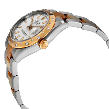 Stainless steel case with a stainless steel Rolex oyster bracelet with 18kt yellow gold center links. Fixed 18kt yellow gold bezel set with diamonds. White dial with gold-tone hands and index / Roman numeral hour markers. Minute markers around the outer rim. Dial Type: Analog. Luminescent hands and markers. Date display at the 3 o'clock position. Rolex calibre 2235 automatic movement with a 48-hour power reserve. Scratch resistant sapphire crystal. Screw down crown. Solid case back. Case size: 31 mm. Round case shape. Oysterlock clasp. Water resistant at 100 meters / 330 feet. Functions: date, hour, minute, second. Dress watch style. Watch label: Swiss Made. Rolex Datejust 31 Automatic White Dial Ladies 18K Gold Watch 178343WSO.