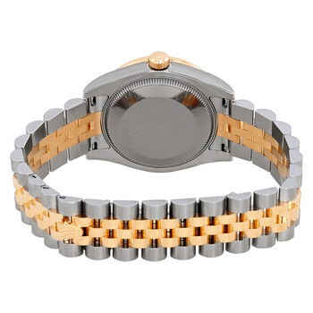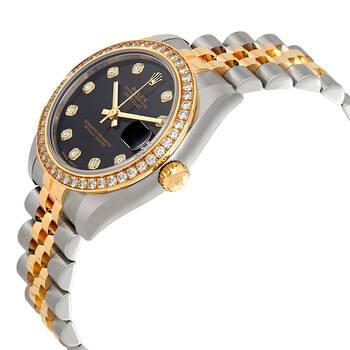 Stainless steel case with a stainless steel Rolex jubilee bracelet with 18kt yellow gold center links. Fixed 18kt yellow gold diamond-set bezel. Black dial with yellow gold-tone hands and diamond hour markers. Dial Type: Analog. Date display at the 3 o'clock position. Automatic movement. Scratch resistant sapphire crystal. Screw down crown. Solid case back. Case size: 31 mm. Round case shape. Concealed crown clasp. Water resistant at 100 meters / 330 feet. Functions: date, hour, minute, second. Luxury watch style. Watch label: Swiss Made. Rolex Datejust 31 Black Diamond Dial Automatic Ladies Watch 178383BKDJ.