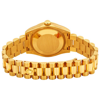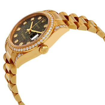 18kt yellow gold case with a 18kt yellow gold rolex president bracelet. Fixed 18kt yellow gold diamond set bezel. Black mother of pearl jubilee dial with yellow gold-tone hands and diamond hour markers. Dial Type: Analog. Date display at the 3 o'clock position. Rolex Calibre 2235 Automatic movement, containing 31 Jewels, bitting at 28800 vph, and has a power reserve of approximately 48 hours. Scratch resistant sapphire crystal. Screw down crown. Solid case back. Round case shape, case size: 31 mm. Crown clasp. Water resistant at 100 meters / 330 feet. Functions: date, hour, minute, second, chronometer. Datejust 31 Series. Luxury watch style. Watch label: Swiss Made. Rolex Datejust 31 Black Mother of Pearl Jubilee Diamond Dial Ladies 18kt Yellow Gold President Watch 178158BKMJDP.