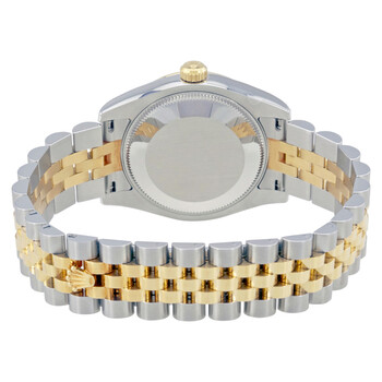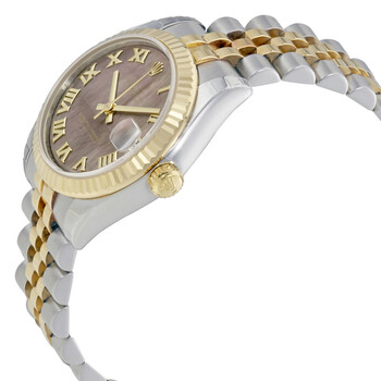 Silver-tone stainless steel case with a two-tone (silver-tone and yellow gold-tone) stainless steel and 18kt yellow gold rolex jubilee bracelet. Fixed fluted 18kt yellow gold bezel. Black mother of pearl dial with yellow gold-tone hands and Roman numeral hour markers. Dial Type: Analog. Date display at the 3 o'clock position. Rolex Calibre 2235 Automatic movement, containing 31 Jewels, bitting at 28800 vph, and has a power reserve of approximately 48 hours. Scratch resistant sapphire crystal. Screw down crown. Solid case back. Round case shape, case size: 31 mm. Deployment clasp. Water resistant at 100 meters / 330 feet. Functions: date, hour, minute, second, chronometer. Oyster Perpetual Datejust 31 Series. Luxury watch style. Watch label: Swiss Made. Rolex Datejust 31 Black Mother of Pearl Steel and 18K Yellow Gold Ladies Watch 178273BKMRJ.