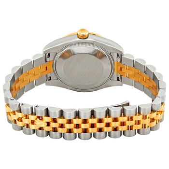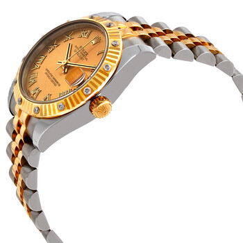 Stainless steel case with a stainless steel Rolex jubilee bracelet with 18kt yellow gold center links. Fixed fluted 18kt yellow gold bezel set with diamonds. Champagne dial with yellow gold-tone hands and Roman numeral hour markers. Dial Type: Analog. Date display at the 3 o'clock position. Rolex calibre 2235 automatic movement with a 48-hour power reserve. Scratch resistant sapphire crystal. Screw down crown. Solid case back. Round case shape. Case size: 31 mm. Water resistant at 100 meters / 330 feet. Functions: date, hour, minute, second. Luxury watch style. Watch label: Swiss Made. Rolex Datejust 31 Champagne Dial Automatic Diamond Ladies Jubilee Watch 178313CRJ.