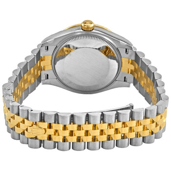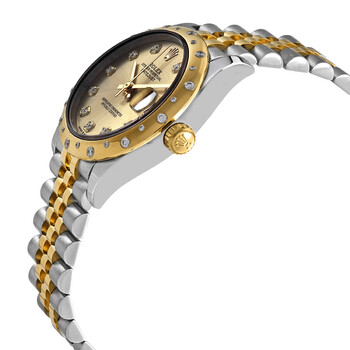 Stainless steel case with a stainless steel jubilee bracelet with 18kt yellow gold center links. Fixed 18kt yellow gold bezel set with diamonds. Champagne dial with yellow gold hands and diamond hour markers. Dial Type: Analog. Date display at the 3 o'clock position. Rolex calibre 2236 automatic movement, based upon Rolex 2235, containing 31 Jewels, bitting at 28800 vph, and has a power reserve of approximately 55 hours. Scratch resistant sapphire crystal. Screw down crown. Solid case back. Round case shape. Case size: 31 mm. Folding oyster clasp. Water resistant at 100 meters / 330 feet. Functions: date, hour, minute, second, chronometer. Datejust 31 Series. Luxury watch style. Watch label: Swiss Made. Rolex Datejust 31 Champagne Diamond Dial Automatic Ladies Steel and 18kt Yellow Gold Jubilee Watch 278343CDJ.
