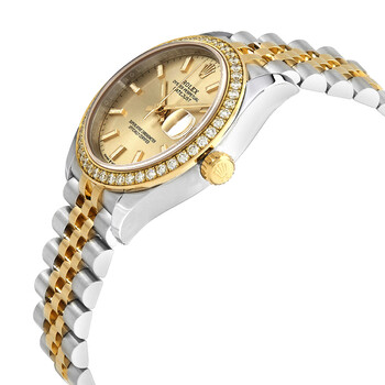 Stainless steel and case with a stainless steel Rolex jubilee bracelet with 18kt yellow gold center links. Fixed 18kt yellow gold bezel set with diamonds. Champagne dial with yellow gold hands and diamond hour markers. Dial Type: Analog. Date display at the 3 o'clock position. Rolex calibre 2236 automatic movement, based upon Rolex 2235, containing 31 Jewels, bitting at 28800 vph, and has a power reserve of approximately 55 hours. Scratch resistant sapphire crystal. Screw down crown. Solid case back. Round case shape. Case size: 31 mm. Oyster clasp. Water resistant at 100 meters / 330 feet. Functions: date, hour, minute, second. Datejust 31 Series. Luxury watch style. Watch label: Swiss Made. Rolex Datejust 31 Champagne Diamond Dial Ladies Steel and 18kt Yellow Gold Jubilee Watch 278383CSJ.