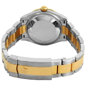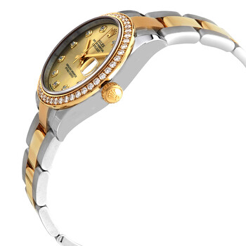 Stainless steel case with a stainless steel Rolex oyster bracelet with 18kt yellow gold center links. Fixed 18kt yellow gold bezel set with diamonds. Champagne dial with yellow gold hands and diamond hour markers. Dial Type: Analog. Date display at the 3 o'clock position. Rolex calibre 2236 automatic movement, based upon Rolex 2235, containing 31 Jewels, bitting at 28800 vph, and has a power reserve of approximately 55 hours. Scratch resistant sapphire crystal. Screw down crown. Solid case back. Round case shape. Case size: 31 mm. Oyster clasp. Water resistant at 100 meters / 330 feet. Functions: date, hour, minute, second. Datejust 31 Series. Luxury watch style. Watch label: Swiss Made. Rolex Datejust 31 Champagne Diamond Dial Ladies Steel and 18kt Yellow Gold Oyster Watch 278383CDO.