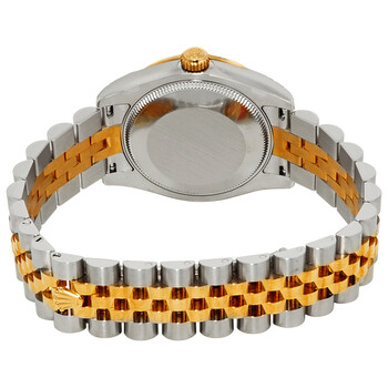 Stainless steel case with a stainless steel Rolex oyster bracelet with 18kt yellow gold center links. Fixed fluted 18kt yellow gold bezel set with diamonds. Champagne floral dial with yellow gold-tone hands. Arabic numeral appears at the 6 o'clock position. Dial Type: Analog. Date display at the 3 o'clock position. Rolex calibre 2235 automatic movement with a 48-hour power reserve. Scratch resistant sapphire crystal. Screw down crown. Solid case back. Round case shape. Case size: 31 mm. Water resistant at 100 meters / 330 feet. Functions: date, hour, minute, second. Luxury watch style. Watch label: Swiss Made. Rolex Datejust 31 Champagne Floral Dial Automatic Ladies Steel and 18 kt Gold Jubilee Watch 178313CFJ.