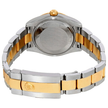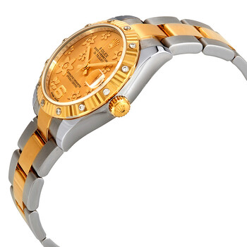 Stainless steel case with a stainless steel and 18kt gold Rolex oyster bracelet. Fixed fluted 18kt yellow gold bezel set with diamonds. Champagne floral dial with yellow gold-tone hands. Arabic numeral appears at the 6 o'clock position. Dial Type: Analog. Date display at the 3 o'clock position. Rolex calibre 2235 automatic movement with a 48-hour power reserve. Scratch resistant sapphire crystal. Screw down crown. Solid case back. Round case shape. Case size: 31 mm. Oysterlock clasp. Water resistant at 100 meters / 330 feet. Functions: date, hour, minute, second. Luxury watch style. Watch label: Swiss Made. Rolex Datejust 31 Champagne Floral Dial Automatic Ladies Steel and 18 kt Gold Oyster Watch 178313CFO.