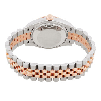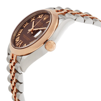 Silver-tone stainless steel case with a two-tone (silver-tone and rose gold-tone) stainless steel and 18kt everose gold jubilee bracelet. Domed rose gold-tone 18kt everose gold bezel. Chocolate dial with everose gold hands and Roman-diamond numeral hour markers. Dial Type: Analog. Date display at the 3 o'clock position. Rolex Calibre 2236 Automatic movement, based upon Rolex 2235, containing 31 Jewels, bitting at 28800 vph, and has a power reserve of approximately 55 hours. Scratch resistant sapphire crystal. Screw down crown. Solid case back. Round case shape, case size: 31 mm. Folding clasp. Water resistant at 100 meters / 330 feet. Functions: date, hour, minute, second. Datejust 31 Series. Luxury watch style. Watch label: Swiss Made. Rolex Datejust 31 Chocolate Dial Automatic Ladies Steel and 18kt Everose Gold Jubilee Watch 278241CHRDJ.