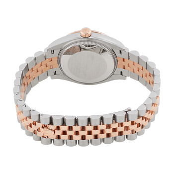 Stainless steel case with a stainless steel jubilee bracelet with 18kt everose gold center links. Fixed fluted 18kt everose gold bezel. Chocolate dial with everose gold hands and Roman numeral hour markers. Diamond-set roman numeral appears at the 6 o'clock position. Dial Type: Analog. Date display at the 3 o'clock position. Rolex calibre 2236 automatic movement, based upon Rolex 2235, containing 31 Jewels, bitting at 28800 vph, and has a power reserve of approximately 55 hours. Scratch resistant sapphire crystal. Screw down crown. Solid case back. Round case shape. Case size: 31 mm. Fold over clasp. Water resistant at 100 meters / 330 feet. Functions: date, hour, minute, second. Datejust 31 Series. Luxury watch style. Watch label: Swiss Made. Rolex Datejust 31 Chocolate Roman Diamond Dial Automatic Ladies Steel and 18kt Everose Gold Jubilee Watch 278271CHRDJ.