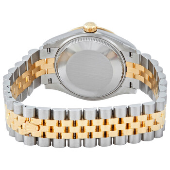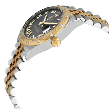 Stainless steel case with a stainless steel Rolex jubilee bracelet with 18kt yellow gold center links. Fixed 18kt yellow gold bezel set with diamonds. Dark grey dial with yellow gold hands and Roman numeral hour markers. Dial Type: Analog. Date display at the 3 o'clock position. Rolex calibre 2236 automatic movement, based upon Rolex 2235, containing 31 Jewels, bitting at 28800 vph, and has a power reserve of approximately 55 hours. Scratch resistant sapphire crystal. Screw down crown. Solid case back. Round case shape. Case size: 31 mm. Folding oyster clasp. Water resistant at 100 meters / 330 feet. Functions: date, hour, minute, second, chronometer. Luxury watch style. Watch label: Swiss Made. Rolex Datejust 31 Dark Grey Dial Automatic Ladies Steel and 18kt Yellow Gold Jubilee Watch 278343DGYDRJ.