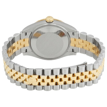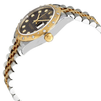 Stainless steel case with a stainless steel Rolex jubilee bracelet with 18kt yellow gold center links. Fixed 18kt yellow gold bezel set with diamondsl. Dark grey dial with yellow gold hands and diamond hour markers. Dial Type: Analog. Date display at the 3 o'clock position. Rolex calibre 2236 automatic movement, based upon Rolex 2235, containing 31 Jewels, bitting at 28800 vph, and has a power reserve of approximately 55 hours. Scratch resistant sapphire crystal. Screw down crown. Solid case back. Round case shape. Case size: 31 mm. Folding oyster clasp. Water resistant at 100 meters / 330 feet. Functions: date, hour, minute, second, chronometer. Luxury watch style. Watch label: Swiss Made. Rolex Datejust 31 Dark Grey Diamond Dial Automatic Ladies Steel and 18kt Yellow Gold Jubilee Watch 278343DGYDJ.