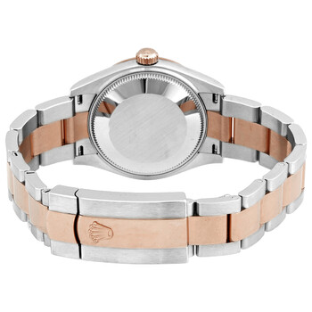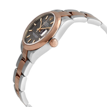 Stainless steel case with a stainless steel Rolex oyster bracelet with 18kt everose gold center links. Domed 18kt everose gold bezel. Dark rhodium dial with everose gold hands and index hour markers. Minute markers around the outer rim. Dial Type: Analog. Luminescent hands and markers. Date display at the 3 o'clock position. Rolex calibre 2236 automatic movement, based upon Rolex 2235, containing 31 Jewels, bitting at 28800 vph, and has a power reserve of approximately 55 hours. Scratch resistant sapphire crystal. Screw down crown. Solid case back. Round case shape. Case size: 31 mm. Fold over clasp. Water resistant at 100 meters / 330 feet. Functions: date, hour, minute, second. Datejust 31 Series. Luxury watch style. Watch label: Swiss Made. Rolex Datejust 31 Dark Rhodium Dial Automatic Ladies Steel and 18kt Everose Gold Oyster Watch 278241DRSO.