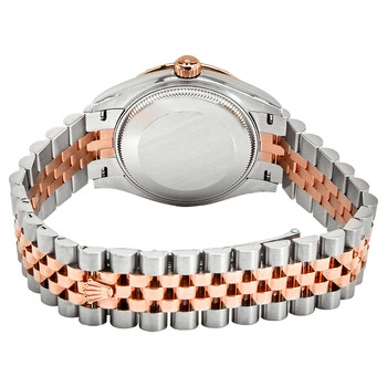 Stainless steel case with a stainless steel Rolex jubilee bracelet with 18kt everose gold center links. Fixed 18kt everose gold bezel set with diamonds. Dark rhodium dial with everose gold hands and Roman numeral hour markers. A diamond-set Roman numeral appears at the 6 o'clock position. Dial Type: Analog. Date display at the 3 o'clock position. Rolex calibre 2236 automatic movement, based upon Rolex 2235, containing 31 Jewels, bitting at 28800 vph, and has a power reserve of approximately 55 hours. Scratch resistant sapphire crystal. Screw down crown. Solid case back. Round case shape. Case size: 31 mm. Fold over clasp. Water resistant at 100 meters / 330 feet. Functions: date, hour, minute, second. Luxury watch style. Watch label: Swiss Made. Rolex Datejust 31 Dark Rhodium Dial Ladies Steel and 18kt Everose Gold Jubilee Watch 278341DRRDJ.