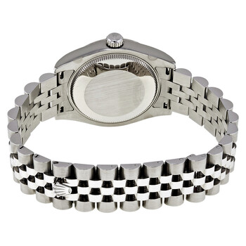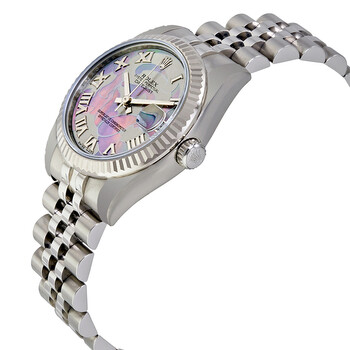 Stainless steel case with a stainless steel Rolex jubilee bracelet. Fixed fluted 18kt white gold bezel. Goldust dream mother of pearl dial with silver-tone hands and Roman numeral hour markers. Minute markers around the outer rim. Dial Type: Analog. Date display at the 3 o'clock position. Rolex calibre 2235 automatic movement with a 48-hour power reserve. Scratch resistant sapphire crystal. Screw down crown. Solid case back. Case size: 31 mm. Round case shape. Concealed crown clasp. Water resistant at 100 meters / 330 feet. Functions: date, hour, minute, second. Luxury watch style. Watch label: Swiss Made. Rolex Datejust 31 Goldust Dream Mother of Pearl 18K White Gold Bezel Ladies Watch 178274GDMRJ.
