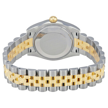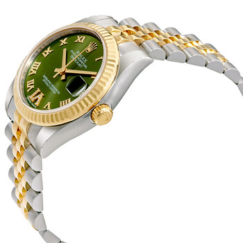 Stainless steel case with a stainless steel Rolex jubilee bracelet with 18kt yellow gold center links. Fixed fluted 18kt yellow gold bezel. Green dial with yellow gold hands and Roman numeral hour markers. Diamond-filled VI Roman numeral at the 6 o'clock position. Dial Type: Analog. Date display at the 3 o'clock position. Automatic movement with a 48-hour power reserve. Scratch resistant sapphire crystal. Screw down crown. Solid case back. Case size: 31 mm. Round case shape. Concealed crown clasp. Water resistant at 100 meters / 330 feet. Functions: date, hour, minute, second. Luxury watch style. Watch label: Swiss Made. Rolex Datejust 31 Green Roman Numeral Diamond Dial Steel and 18K Yellow Gold Ladies Watch 178273GNRDJ.