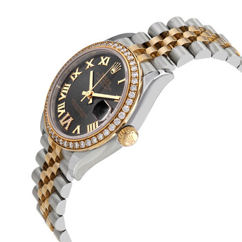 Stainless steel case with a stainless steel jubilee bracelet with 18kt yellow gold center links. Fixed 18kt yellow gold bezel set with diamonds. Grey dial with yellow gold hands and Roman numeral hour markers. Diamond-set roman numerals appear at the 6 o'clock position. Dial Type: Analog. Date display at the 3 o'clock position. Rolex calibre 2236 automatic movement, based upon Rolex 2235, containing 31 Jewels, bitting at 28800 vph, and has a power reserve of approximately 55 hours. Scratch resistant sapphire crystal. Screw down crown. Solid case back. Round case shape. Case size: 31 mm. Fold over clasp. Water resistant at 100 meters / 330 feet. Functions: date, hour, minute, second. Datejust 31 Series. Luxury watch style. Watch label: Swiss Made. Rolex Datejust 31 Grey Dial Ladies Steel and 18kt Yellow Gold Jubilee Watch 278383GYRDJ.