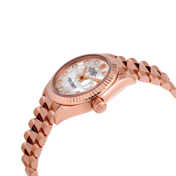 18kt everose gold case with a 18kt everose gold Rolex president bracelet. Fixed fluted 18kt everose gold bezel. White mother of pearl dial with everose gold hands and diamond hour markers. Dial Type: Analog. Date display at the 3 o'clock position. Rolex calibre 2236 automatic movement, based upon Rolex 2235, containing 31 Jewels, bitting at 28800 vph, and has a power reserve of approximately 55 hours. Scratch resistant sapphire crystal. Screw down crown. Solid case back. Round case shape. Case size: 31 mm. Fold over clasp. Water resistant at 100 meters / 330 feet. Functions: date, hour, minute, second. Datejust 31 Series. Luxury watch style. Watch label: Swiss Made. Rolex Datejust 31 Mother of Pearl Diamond Dial Ladies 18kt Everose Gold President Watch 278275MDP.