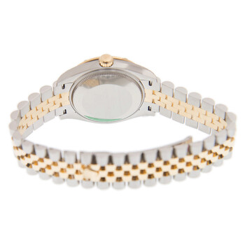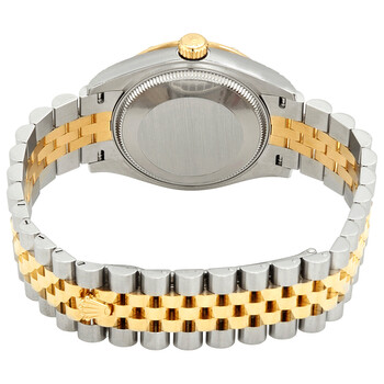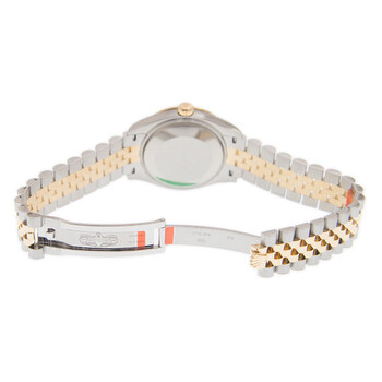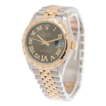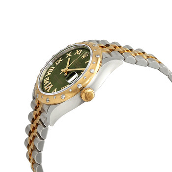 Silver-tone stainless steel and 18kt yellow gold case with a two-tone (silver-tone and gold-tone) stainless steel and 18kt yellow gold jubilee bracelet. Fixed gold-tone diamond set bezel. Olive green dial with yellow gold hands and Roman numeral hour markers. Dial Type: Analog. Date display at the 3 o'clock position. Rolex Calibre 2236 automatic movement with a 55-hour power reserve. Scratch resistant sapphire crystal. Screw down crown. Solid case back. Round case shape. Case size: 31 mm. Folding oyster clasp. Water resistant at 100 meters / 330 feet. Functions: date, hour, minute, second. Luxury watch style. Watch label: Swiss Made. Rolex Datejust 31 Olive Green Dial Automatic Ladies Steel and 18kt Yellow Gold Jubilee Watch 278343GNRDJ.