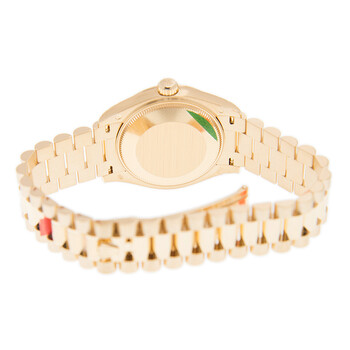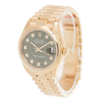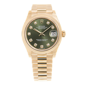 18kt yellow gold case with a 18kt yellow gold rolex president bracelet. Fixed 18kt yellow gold bezel. Olive green dial with gold-tone hands and diamond hour markers. Dial Type: Analog. Date display at the 3 o'clock position. Rolex Calibre 2236 Automatic movement, based upon Rolex 2235, containing 31 Jewels, bitting at 28800 vph, and has a power reserve of approximately 55 hours. Scratch resistant sapphire crystal. Screw down crown. Solid case back. Round case shape. Case size: 31 mm. Water resistant at 100 meters / 330 feet. Functions: date, hour, minute, second. Luxury watch style. Watch label: Swiss Made. Rolex Datejust 31 Olive Green Diamond Dial Automatic Ladies 18kt Yellow Gold President Watch 278248GNDP.